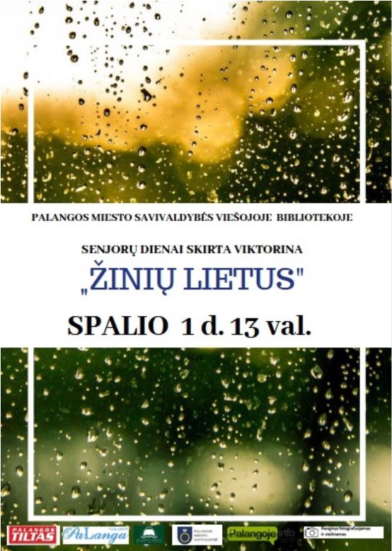 Spalio 1 d. 13 val. kviečiame į viktoriną „Žinių lietus“, skirtą pagyvenusių žmonių dienai paminėti. Būsimuosius viktorinos dalyvius kviečiame jau iš anksto burtis į komandas, kurias turėtų sudaryti iki 5 žmonių. Tačiau jei suburti komandos nepavyksta – ne bėda, kadangi komandos iš pavienių senjorų, norinčių dalyvauti viktorinoje, bus sudaromos ir renginio dieną.