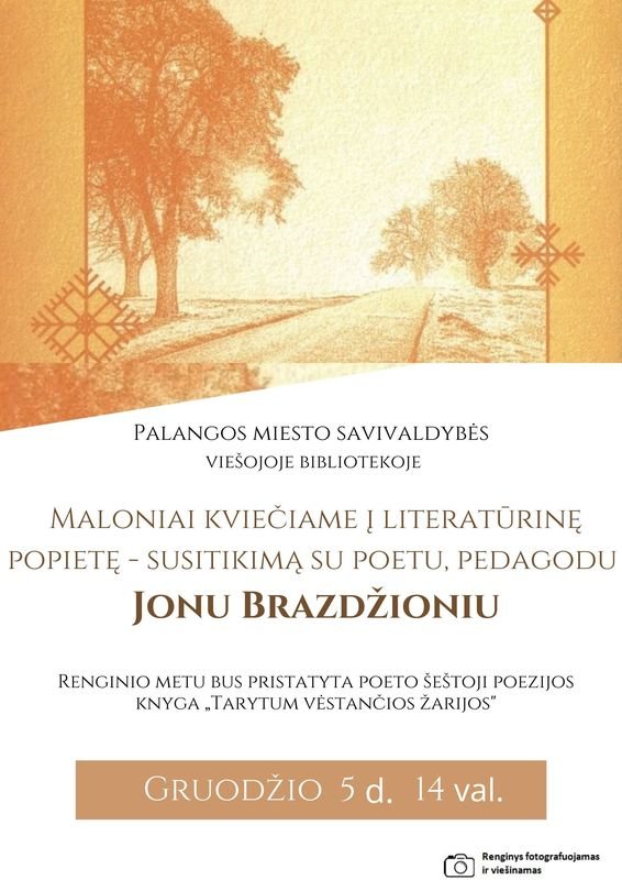 Gruodžio 5 d. 14 val. kviečiame į literatūrinę popietę - susitikimą su poetu, pedagogu Jonu Brazdžioniu. Renginio metu bus pristatyta poeto šeštoji poezijos knyga „Tarytum vėstančios žarijos".