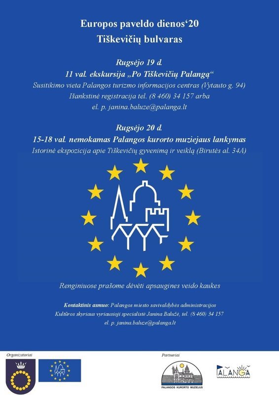 Rugsėjo 19 d. 11 val. organizuojama ekskursija "Po Tiškevičių Palangą" (būtina registracija). Ekskursija prasidės nuo Palangos turizmo informacijos centro (Vytauto g. 94)