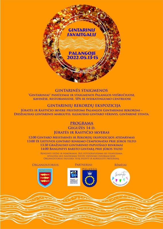 „GINTARINIS SAVAITGALIS 2022“ Gegužės 13-15 d. - tradicinis Palangos renginys, rengiamas keturioliktą kartą, skirtas populiarinti pajūrio gintaro apdirbimo amatą, juvelyriką, legendas, gydomąsias ir ezoterines gintaro savybes, edukacinius užsiėmimus, gintaro naudojimą buityje, medicinoje, puošyboje, kulinarijoje. Renginio metu bus organizuojamas devintasis Lietuvos gintaro rinkimo čempionatas, renkamas šventės dalyvis su gražiausiu gintaro papuošalu ar aksesuaru, organizuojama gintaro barstymo pajūryje atrakcija. Planuojama kurorto viešbučių ir kavinių bei restoranų svečiams suteikti originalių gintarinių staigmenų bei pristatyti Gintarinių rekordų ekspoziciją - Didžiausius Lietuvoje Gintarinį margutį, gintarinę stintą, gintaro vėrinį. Bus organizuojama „Gintaro Meistarnė“, kurioje gintaro apdirbimo meistrai demonstruos ir mokys norinčius gintaro apdirbimo amato subtilybes. Jūratės ir Kastyčio skveras šį savaitgalį taps savotiškais legendiniais Jūratės Gintaro namais.