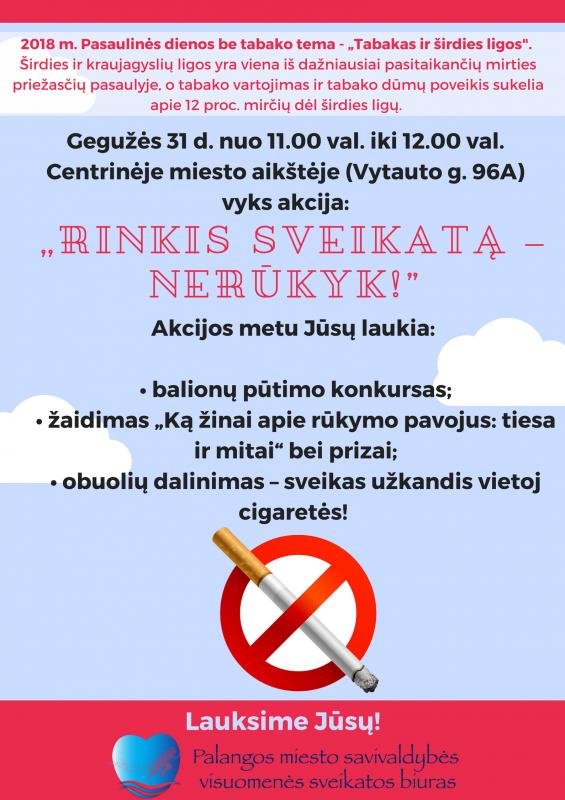 Gegužės 31 d. nuo 11.00 val. iki 12.00 val. Centrinėje miesto aikštėje (Vytauto g. 96A) vyks akcija „Rinkis sveikatą – nerūkyk!”