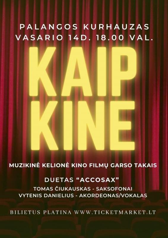 Duetas “AccoSax” pristato muzikinę kelionę žymiausių kino filmų garso takais. Akordeonistas Vytenis Danielius ir saksofonistas Tomas Čiukauskas savitai interpretuos Jums puikiai žinomų kino filmų melodijų motyvus. Muzikinis pokalbis, improvizacija klausytojus įtrauks į dinamišką ir kartu romantišką vakaro nuotaiką, kuri kvies pasijusti kaip kine.