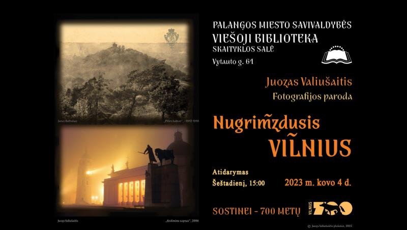 Gedimino sostinės Vilniaus 700-ąją sukaktį kviečiame pasitikti ir Palangos viešosios bibliotekos skaityklos salėje, kur kovo mėnesį eksponuojama fotodailininko Juozo Valiušaičio fotografijų parodą „Nugrimzdusis Vilnius“. Parodos autoriai – pirmieji fiksavę Vilniaus miestą fotografai: Juozapas Čechavičius (1808–1888), Stanislavas Fleury (1858–1915), Janas Bulhakas (1878–1950). Juozo Valiušaičio fotografijos – šiandienos Vilniaus atspindys.