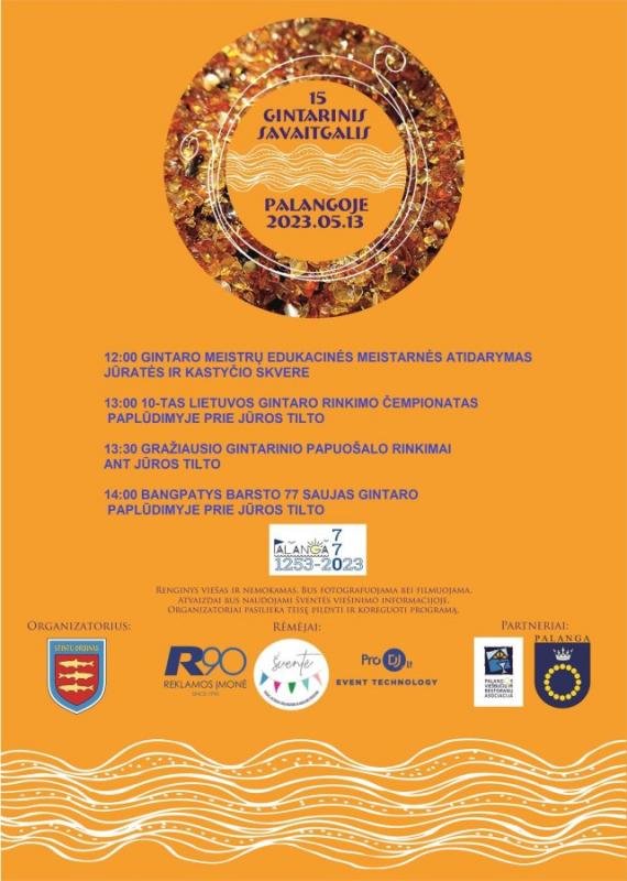 “GINTARINIS SAVAITGALIS“ - tradicinis Palangos renginys, rengiamas penkioliktą kartą, skirtas populiarinti pajūrio gintaro apdirbimo amatą, juvelyriką, legendas, gydomąsias ir ezoterines gintaro savybes, edukacinius užsiėmimus, gintaro naudojimą buityje, medicinoje, puošyboje, kulinarijoje. Renginio metu bus organizuojamas 10 - tasis Lietuvos gintaro rinkimo čempionatas, renkamas šventės dalyvis su gražiausiu gintaro papuošalu ar aksesuaru, organizuojama gintaro barstymo pajūryje atrakcija. veiks „Gintaro Meistarnė“, kurioje gintaro apdirbimo meistrai demonstruos ir mokys norinčius gintaro apdirbimo amato subtilybes. Gegužės 13-oji – Meilės, laisvės deivės Mildos diena, kai žydint sodams norisi sakyti tik meilės žodžius, prisiliesti prie amžinojo meilės šaltinio kartu su žmonėmis, kuriuos myli, kurių lauki.