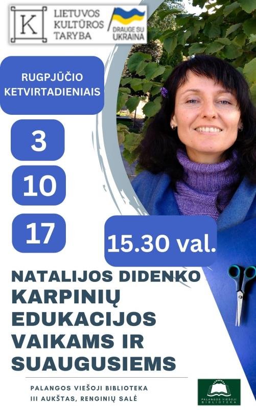 Rugpjūčio 3, 10 ir 17 dienomis (ketvirtadieniais) ukrainiečių grafikė Natalija Didenko kviečia visus į karpinių edukacijas vaikams ir suaugusiems. Užsiėmimai vyks Palangos viešosios bibliotekos III aukšte, renginių salėje.
