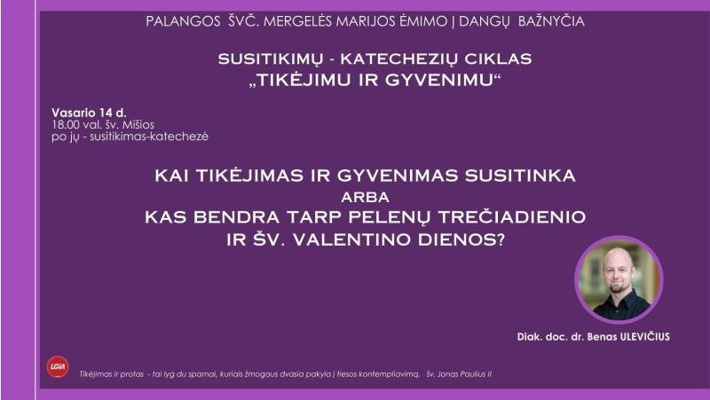 Vasario 14 d. po 18.00 šv. Mišių drauge su diak. doc. dr. Benu ULEVIČIUMI ieškosime sąsajų tarp tikėjimo ir gyvenimo bei tarp Pelenų trečiadienio ir Valentino dienos.