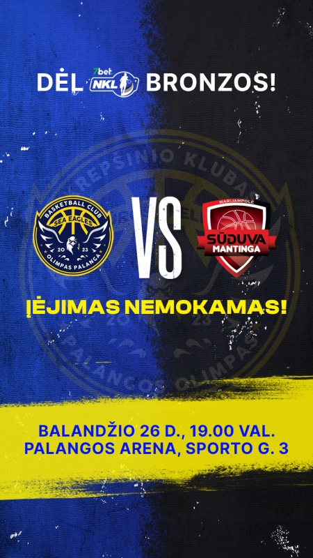 Lemiamos, penktosios, Nacionalinės krepšinio lygos (7bet-NKL) mažojo finalo serijos rungtynės tarp Palangos „Olimpo“ ir Marijampolės „Sūduvos-Mantingos“. Serijoje iki trijų pergalių yra lygu 2-2. Bronzos medalių laimėtojai paaiškės balandžio 26 dieną, 19.00 val., Palangos sporto centro arenoje (Sporto g. 3).