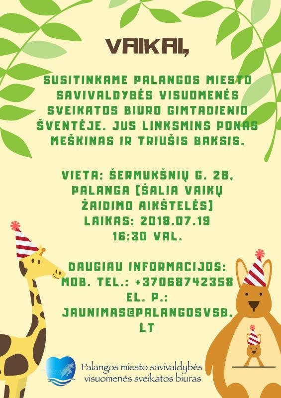 Palangos miesto savivaldybės visuomenės sveikatos biuras vaikus kviečia į gimtadienio šventę. Mažuosius linksmins Ponas Meškinas ir Triušis Baksis.