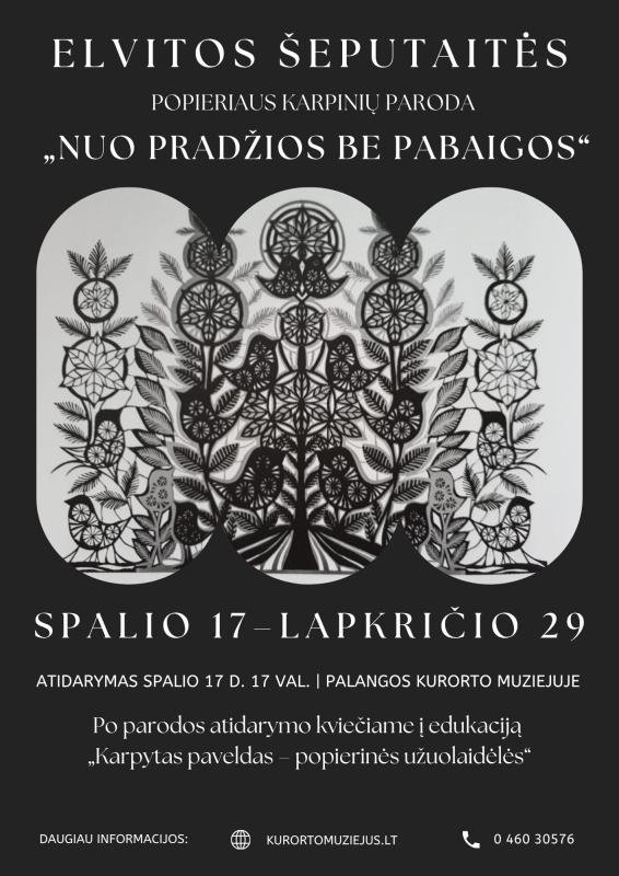 Palangos kurorto muziejuje atidaroma tautodailininkės, meno kūrėjos Elvitos Šeputaitės popieriaus karpinių paroda „Nuo pradžios be pabaigos“. Šią parodą papildys edukacija „Karpytas paveldas – popierinės užuolaidėlės“.