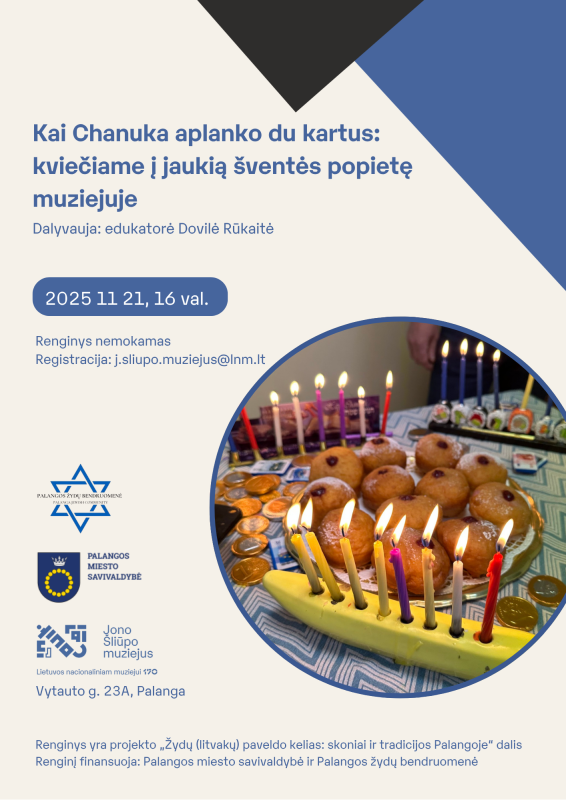 Lietuvos nacionalinio muziejaus padalinys Palangos burmistro Jono Šliūpo muziejus kartu su Palangos žydų bendruomene lapkričio 21 d. 16 val. kviečia susitikti jaukioje popietėje, kupinoje pasakojimų, tradicijų ir bendrystės. Ar žinote, kad Chanuką šiemet žydai švenčia du kartus? Vadinasi, prikeps dar daugiau „latkių“ ir spurgų!