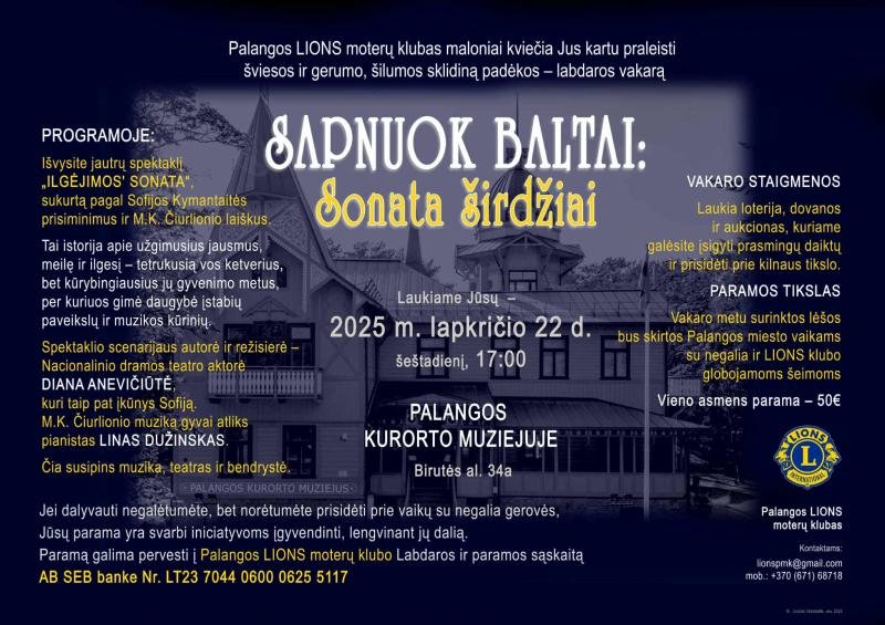 Laukiame Jūsų muzikiniame vakare, kuriame menas tampa širdies sonata, o bendrystė – tikra pagalba Palangos miesto vaikams su negalia ir klubo globojamoms šeimoms remti.