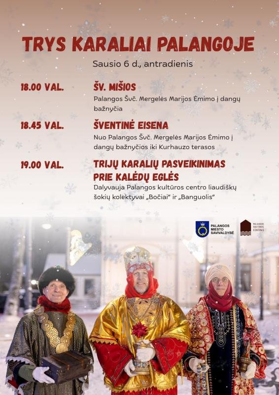 Sausio 6-ąją, antradienį, Palangoje šventiškai atsisveikinsime su žiemos švenčių laikotarpiu – miestą užlies Trijų Karalių džiaugsmas, šviesa ir muzika. Tai vakaras, kai dar kartą susitinkame prie eglės, pasidalijame šypsenomis, padėkomis už praėjusius metus ir su gera nuotaika pasitinkame naujus.