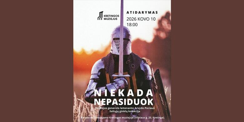 Kovo 10-osios vakarą, Lietuvai brangios Valstybės atkūrimo dienos išvakarėse, kviečiame į Kretingos muziejų. Drauge atversime buvusio Lietuvos kariuomenės vado (2009-2014), dimisijos generolo leitenanto Arvydo Pociaus šaltųjų ginklų kolekcijos parodą. Paroda, pavadinta „Niekada nepasiduok“, gimė prieš porą metų Lietuvai minint įstojimo į NATO 20-metį. Pirmąja jos eksponavimo stotele buvo Jono Žemaičio Lietuvos karo akademija. Į Kretingos muziejų buvusio k...
